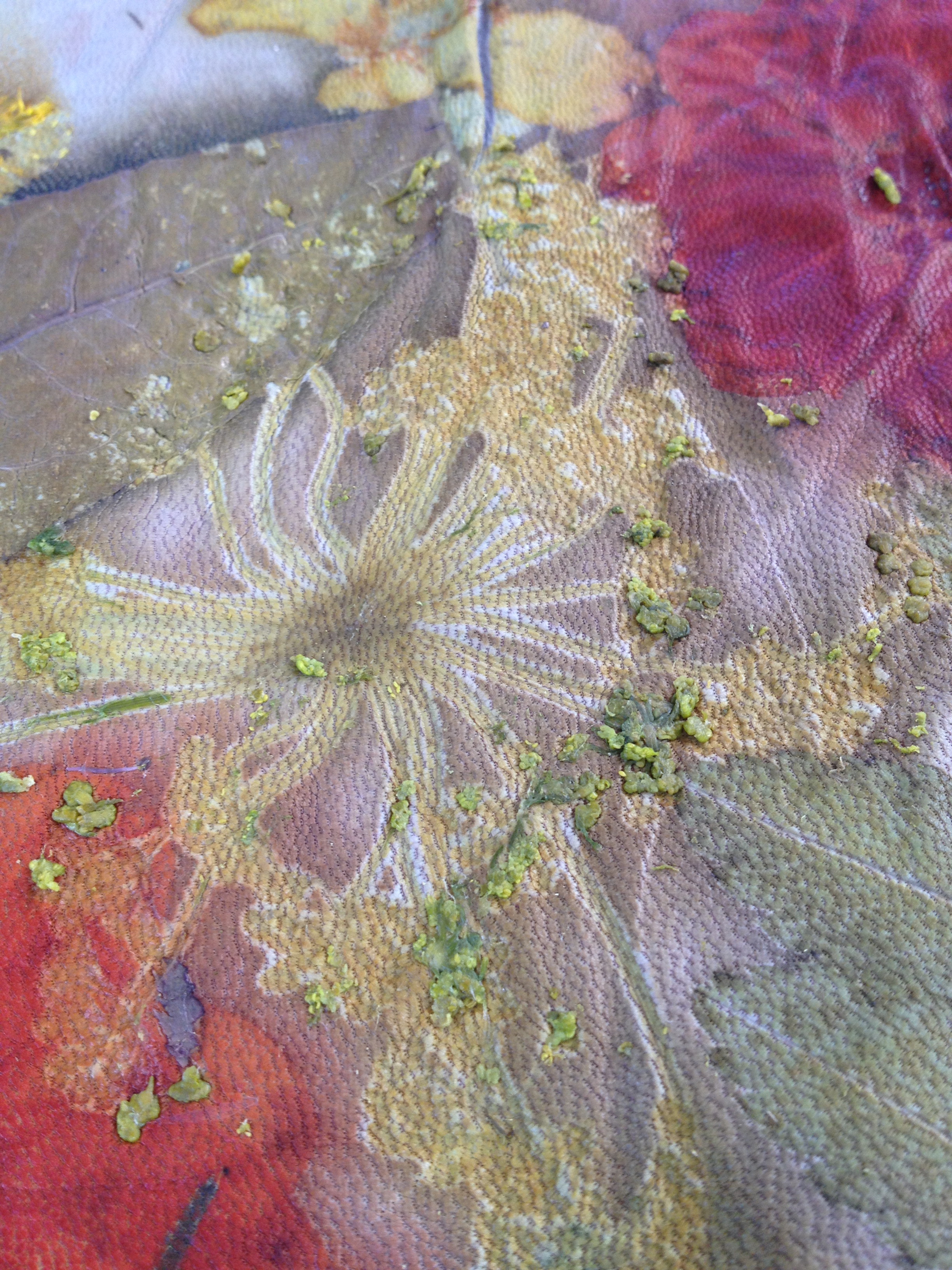 Ook met grassen en schermen van bloemen is het een feest om te Ecoprinten op Leer. Over de grassen zegt Marie-José: “Ik vond ze aan de rand van een weiland en hadden zo’n mooie rode steel, dus ik heb gegokt.”